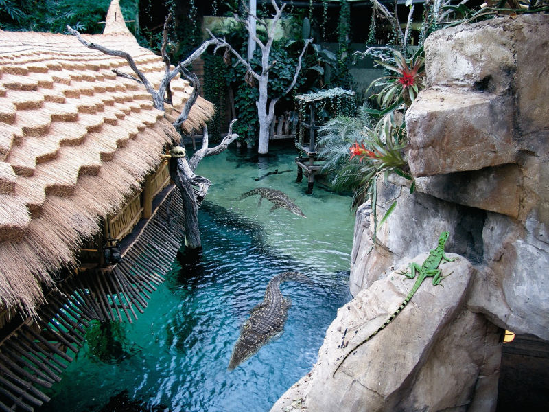 Frei laufende Kattas und Echsen, frei fliegende Vögel, Krokodilsee mit 400.000 Liter Wasser, Wasserfall, Tropenhalle, Höhlenwelt, Giftschlangendort, Unterwasserwelt, Korallensaumriff, Großes Hai-Atoll mit 1,8 Millionen Liter Wasser